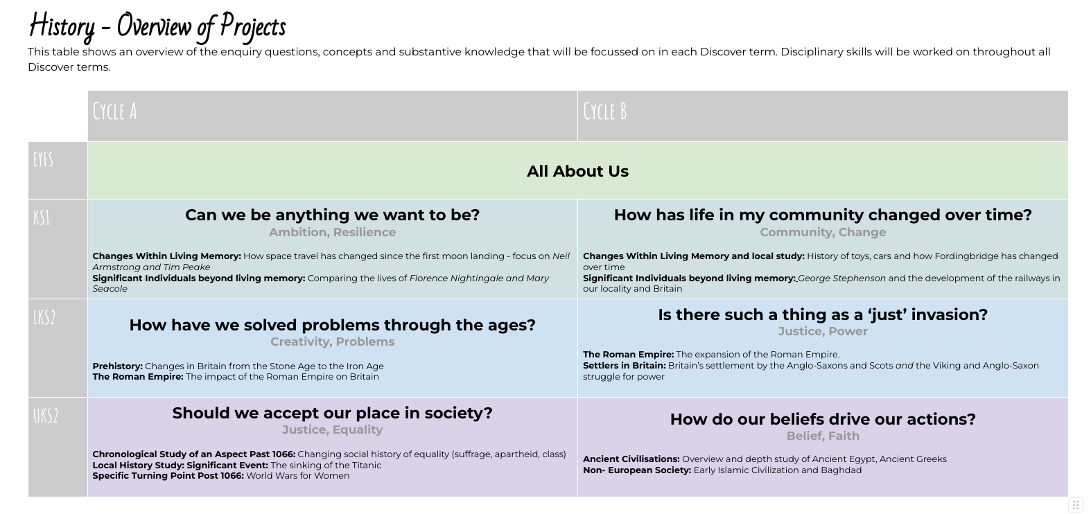 Our aim is to ignite a passion for history within our students and instil a curiosity in them that drives them to discover more about past time periods and civilisations, and the impact they have had on our lives today. By developing their inquiry-based approaches, we hope to foster an interest in local, national and world history in all pupils that both reflects their own ancestry and the history of others around the world. Our curriculum has been designed to capture the children’s interest and enthusiasm and allow them to study each time period in a way that builds their chronological understanding and identifies the links between civilisations and periods. Pupils will also learn a variety of ways in which they can communicate their knowledge and understanding of history, both individually and collaboratively.