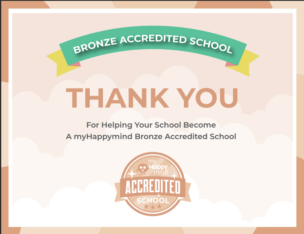 We are proud to announce that we are a myHappymind Bronze Accredited school! This means that, as a school, we consider the mental health and wellbeing of our children as one of our top priorities. We have created a whole school culture that helps build our children's resilience, confidence and self-esteem, as well as teaching them how to regulate in those stressful times. This accreditation badge has been awarded thanks to all the effort our staff, children, governors and parents have put in to bring the lessons of myHappymind to life all around our school!